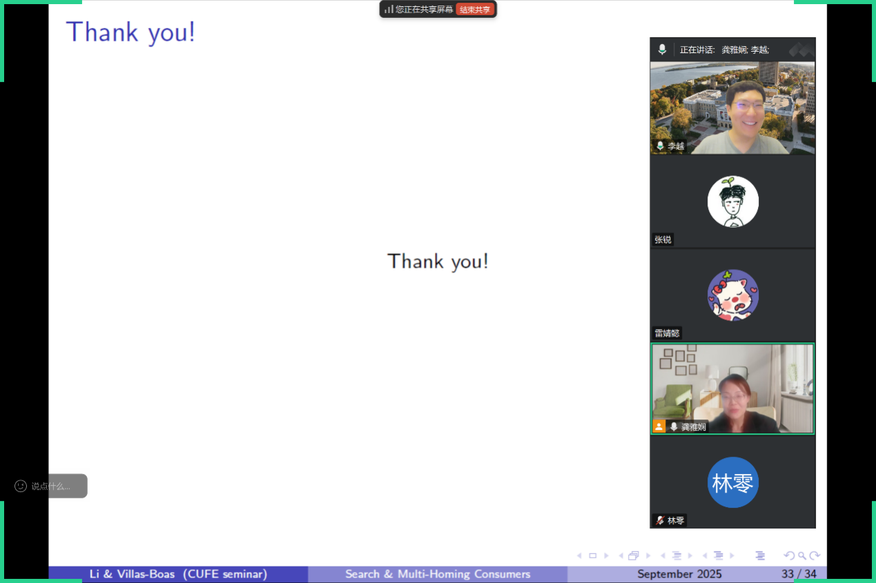 在问答环节,与会师生就模型的现实意义、算法推荐的伦理边界以及未来研究方向与主讲人进行了深入交流。大家一致认为,这项研究为理解数字经济中市场结构的演变、反垄断政策的制定以及企业如何在新生态中竞争提供了重要的理论工具。