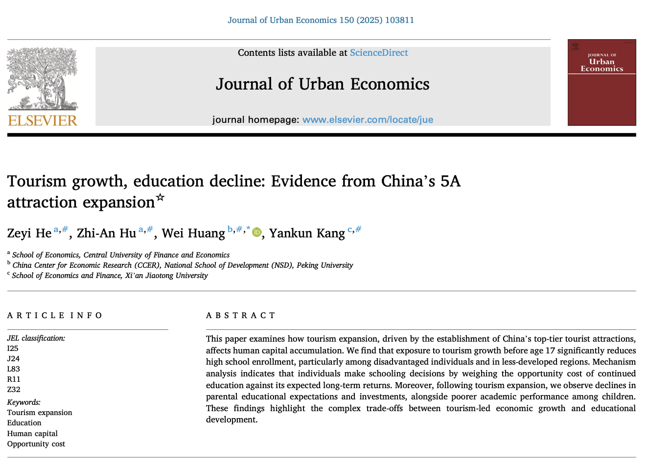 本文研究了中国顶级旅游景点的设立所带来的旅游扩张对人力资本积累的影响。研究发现,17岁之前所处地区经历旅游业增长的个体,其高中入学率显著下降,这一效应在弱势群体和欠发达地区尤为突出。机制分析表明,个体在决定是否继续接受教育时,会权衡继续就学的机会成本与教育所带来的长期回报。此外,在旅游扩张之后,我们观察到家长的教育期望和投入下降,同时儿童的学业表现也更差。总体而言,这些结果揭示了旅游驱动的经济增长与教育发展之间存在复杂的权衡关系。