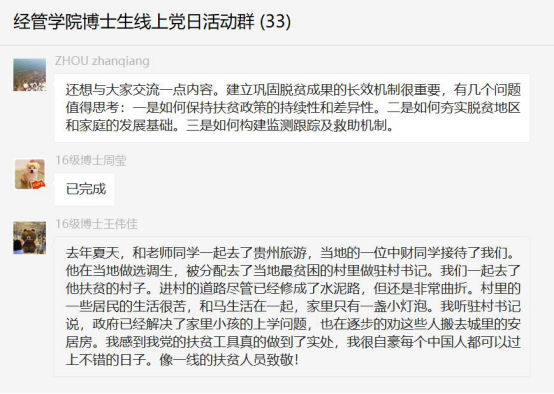 此次党日活动,党支部有效探索了疫情期间开展基层党建的新方式,充分调动了党员参加组织生活的积极性和主动性,真正提升了每一名共产党员的党性修养。同时,借助贫攻坚给每一个党员上了一次深刻的党课,大家深刻认识主题党日活动的重要意义,从严要求自己,在脱贫攻坚的关键时刻,切实发挥党员先锋模范和示范引领作用。最后周战强老师也寄语道:“今天讨论的贫困问题不仅是一个现实问题,还是很多学科都在关注和研究的问题。除了从经济学专业角度分析贫困问题外,还可以借鉴其他学科思路,进行跨学科研究,会有很多新的发现。”大家纷纷表示:要切实增强“四个意识”,坚决做到“两个维护”,以时不我待的政治责任感和紧迫感,积极参与支持脱贫攻坚工作,为打赢脱贫攻坚战贡献自己最大的力量。