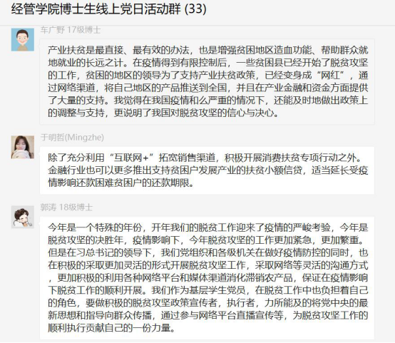 为贯彻中央“决战决胜脱贫攻坚座谈会”会议精神,有效推动疫情防控和基层组织建设紧密结合,永利集团30442016级、2017级、2018级博士生党支部于2020年4月7日联合微观经济学系教工党支部,开展“深化爱国教育,助力脱贫攻坚”线上党日活动。活动由2016级博士生党支部书记于明哲主持,微观经济学系教工党支部书记周战强老师参与指导,活动分为线上线下两个部分。