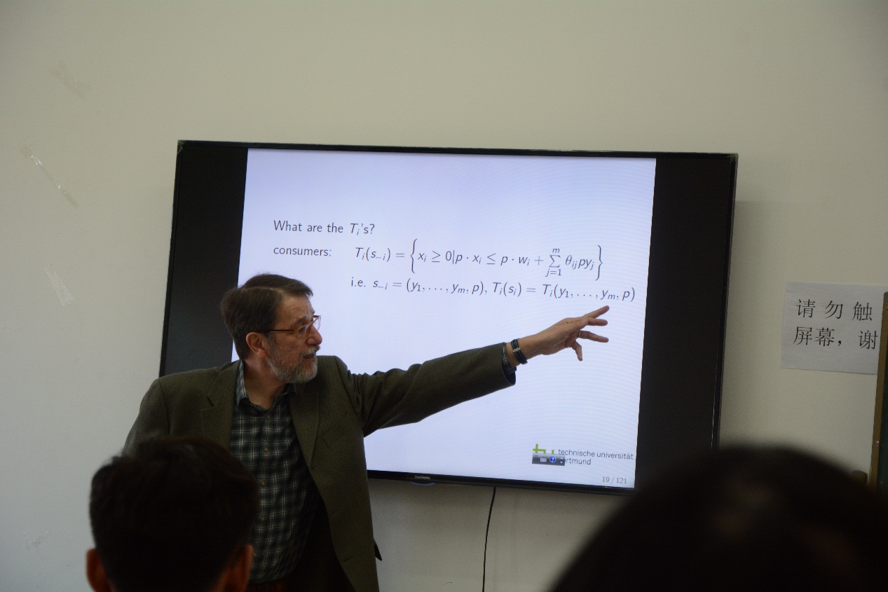 在第一次课程中,教授对经济学的方法论进行了高屋建瓴的阐述,不仅从经济学历史角度讲解了经济发展过程中一般均衡理论的发展脉络,梳理了历次诺贝尔获奖的经济学家,而且从博弈论以及拍卖理论角度阐述了获得诺贝尔奖的经济学家的主要贡献。并对二者进行了对比。从经济学学角度的介绍,给听众带来了非常宏观的经济学研究视角,对百年来经济学发展的深入理解和独特眼光,令人深为敬佩。Leininger教授是德国鲁尔永利集团3044的主要负责人,经常在主要的学术会议上进行精彩评论。Leininger教授的此次精彩演讲向我们展现了德国教授深刻的理论积淀和广博的学识。