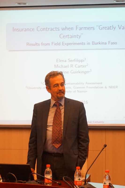 10月27,日UCDavis大学MichaelCarter教授受邀访问永利集团3044,与永利集团3044教师开展午餐讨论会并在永利集团3044经济学名家讲坛做学术报告。午餐讨论会由永利集团3044经理李涛教授主持,Michael Carter教授和公司老师就农业经济学、发展经济学、劳动经济学和中国养老保险等问题展开了热烈的交流,并对青年教师的学术研究提出了诸多指导性的建议。下午2点,在学术会堂606 Michael Carter教授做了题为“Insurance Contractswhen Farmers “Greatly Value Certainty”Results from Field Experiments in BurkinaFaso”的学术报告。报告由永利集团3044副经理陈斌开教授主持,科研处张舰副处长、永利集团3044于爱芝教授、张彩萍副教授、张川川副教授、助理教授孙昂、申广军等多位教师和博士、硕士研究生以及来自南开大学、中国农科院农经所等机构的多位研究人员参加学术报告会。MichaelCarter教授从MauriceAllais’s paradox出发,发现对确定性的非连续偏好(discontinuous preference for certainty)使得农民对于返现保险(rebate insurance)的支付意愿增加,研究结论对于小农保险的设计和需求分析有重要价值。与会教师和员工围绕论文展开了热烈的讨论。