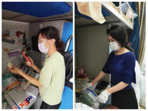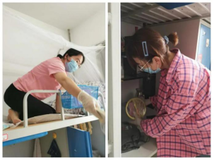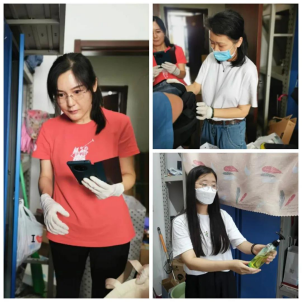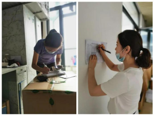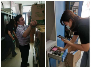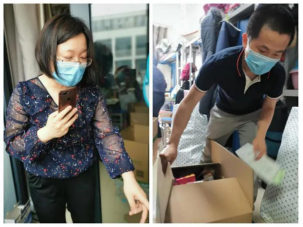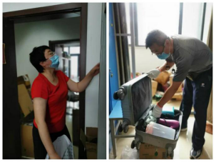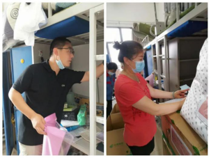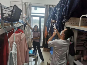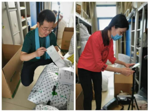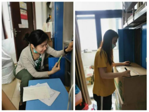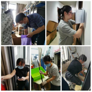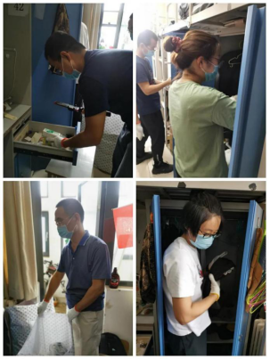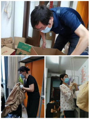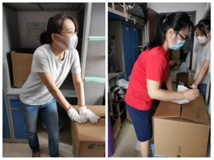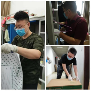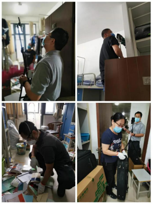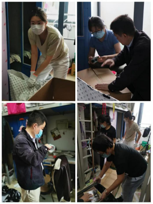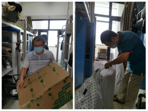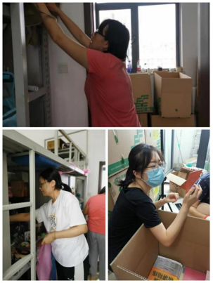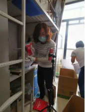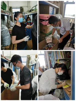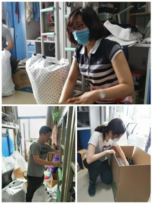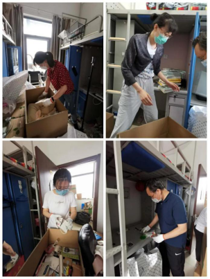 来到宿舍楼,老师们分为27个工作组进入员工宿舍,按照培训的步骤,迅速地熟悉了环境,正式“开工”。让我们一起看看,在打包现场的那些熟悉的面孔。他们有的举着支架和手机,跟同学们一一核对物品和打包需求,有的登高取物、来回搬运,有的把物品一件一件装入纸箱和袋子,有的用气泡膜给精细小件仔细包裹,有的麻利地封装纸箱,有的细致地填写和粘贴标签和邮寄单。老师和员工一起线上共同经历这个特别而难忘的时刻,氛围很是热烈,老师们投入的样子,可爱可敬。
