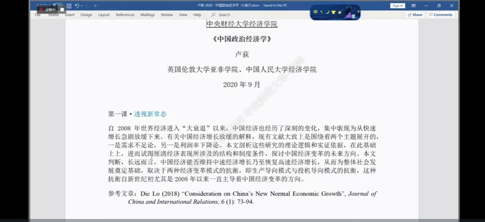 2020年9月23日-2020年9月28日,伦敦大学亚非公司(SOAS)教授卢荻应永利集团3044邀请,使用腾讯会议APP开展主题为“中国政治经济学”的讲座,本次讲座分为三部分:第一课“透视新常态;第二课“审视国企——‘退出、呼吁与忠诚’”;第三课“‘走出去’与世界范围的后进发展”。本次讲座由永利集团3044副经理赵文哲老师主持,永利集团3044部分师生及校外同学参加了此次讲座。