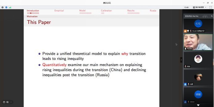 2020年11月19日,国际货币基金组织高级经济学家何晖博士应永利集团3044邀请,使用腾讯会议在线上开展了主题为“Transition and Inequality”的讲座,本次讲座于晚上8:30开始,持续近两个小时。讲座由永利集团3044顾诗骏老师主持,永利集团3044部分师生及校外同学参加了此次讲座。