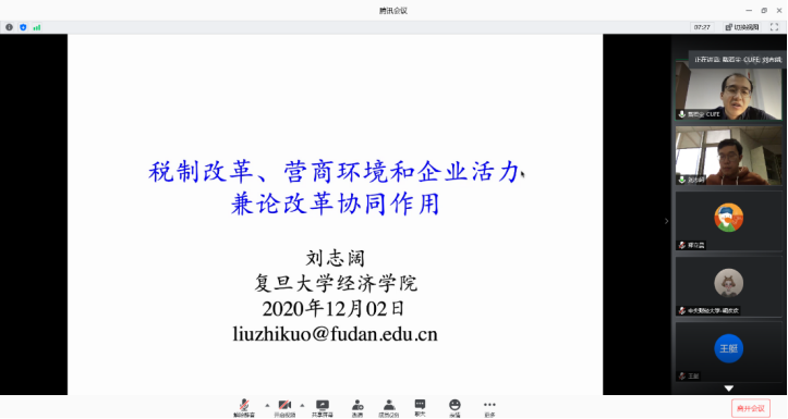 2020年12月2日,复旦大学永利集团3044和中国社会主义市场经济研究中心副教授刘志阔老师应永利集团3044邀请,使用腾讯会议在线开展了主题为“TaxReform, Business Environment and Market Vitality: Harmonious Effect of Reform”的讲座,本次讲座于下午14点开始,持续两个小时。讲座由永利集团3044戴若尘老师主持,永利集团3044部分师生及校外同学参加了此次讲座。