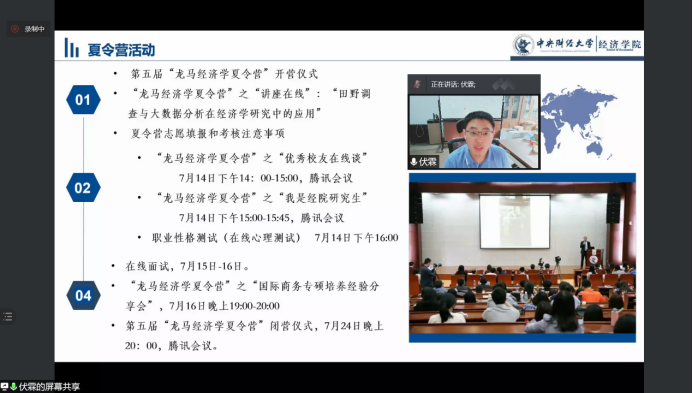 7月16日晚上,第五届“龙马经济学夏令营”闭营仪式通过腾讯会议举行。在闭营仪式之前,为让大家进一步了解国际商务专硕的培养要求和培养效果,组委会为大家带来一场精彩的国际商务专硕培养经验分享会。永利集团3044国际经济学系系主任、农村经济发展中心主任于爱芝教授结合国际商务专硕培养目标和培养过程,为大家介绍了项目进展和取得的成就。2021届国际商务硕士毕业生周京、何京、宋琦分享了自己学习、求职和就业的情况,2020级国际商务硕士徐行健、王宸伟介绍了自己在校学习和课程设置情况。大家就相关问题进行了热烈讨论。