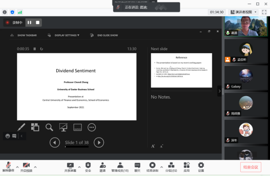 2021年9月16日和21日,英国埃克塞特(Exeter)大学可持续金融中心主任张晨迪教授应永利集团3044邀请,使用腾讯会议APP讲授行为金融专题研究短期课程。20多位师生参加了此次课程。