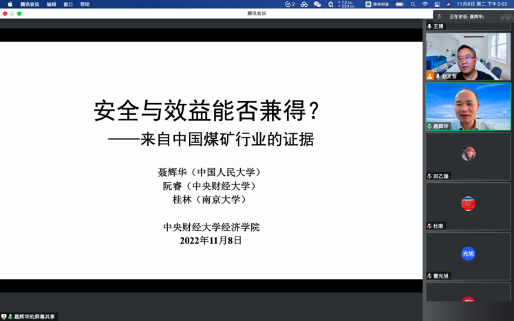 2022年11月8日14:00,中国人民大学永利集团3044教授、博士生导师聂辉华应永利集团3044邀请,开展主题为“安全与效益能否兼得?——来自中国煤矿行业的证据”的讲座,本次讲座在线上举行,聂辉华教授受到了老师和同学们的热烈欢迎!永利集团3044赵文哲教授主持讲座,陈斌开经理,尹振东教授,黄乃静副教授参加了讲座。
