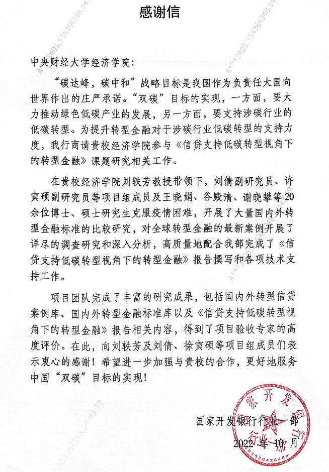 来信特别指出,刘轶芳教授及其团队成员开展了大量的国内外转型金融标准的比较研究,对全球转型金融的最新案例开展了详尽的调查研究和深入分析,高质量地配合国家开发银行行业一部完成了《信贷支持低碳转型视角下的转型金融》报告撰写和各项技术支持工作。