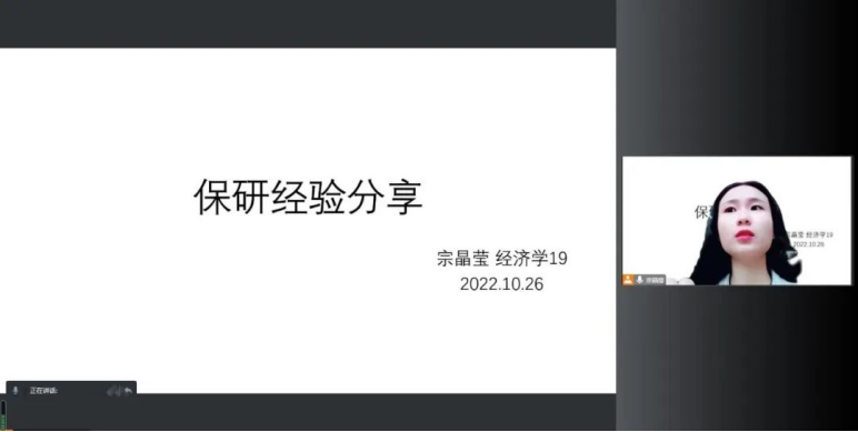 为落实做细精准化学业指导、解决员工升学规划的困惑,在充分做好问卷调研、收集同学的问题后,2022年10月26日晚七点,“经济学家梦工场”德育示范基地组织召开保研经验分享讲座,参会同学覆盖20、21、22三个年级。讲座由公司团委副书记、2020级辅导员梁欣主持,宗晶莹、叶姿童、王可心和寇莹颖四位19级成功保研的同学为学弟学妹们进行保研历程与经验分享,参会同学提问积极、反响热烈。