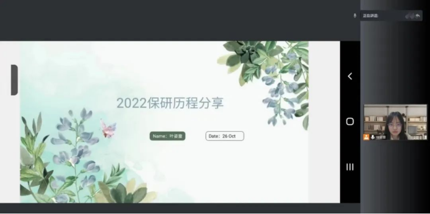 叶姿童同学保研至北京大学教育公司。她谦逊幽默,详细地梳理了保研历程中自己每个月的进程,总结了历程中获取的经验与教训,并且对事先发放问卷中的部分问题进行了回答。她强烈建议同学们尽早开始准备,以便为后续的申请与复习留出充足的时间;另外她强调,面试中轻松的心态能帮助我们留下更好的印象。