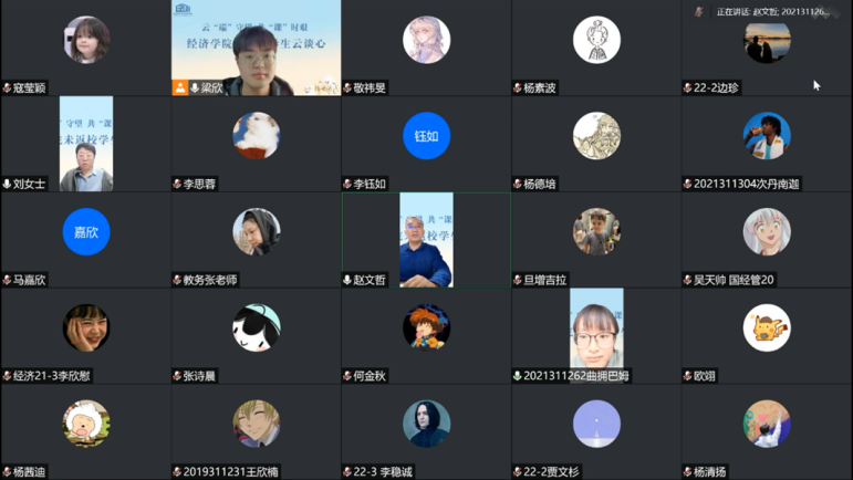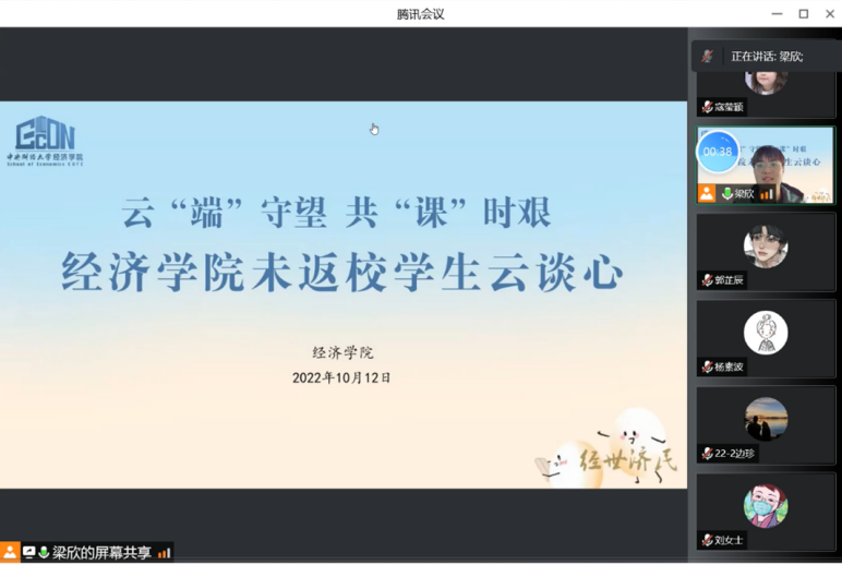 共克时艰携手前行,云端助力经心相守。为深入了解未返校同学们的思想、学习、生活状态,积极引导同学们树立积极乐观的心态,解决员工实际困难,经济于2022年10月12日15:00线上举办了云“端”守望,共“课时艰”——永利集团3044未返校员工“云谈心”活动。公司副经理赵文哲,公司党委副书记耿卉,组织员刘滨,本科教务干事张珏,22级本科生辅导员任晶,公司团委兼职副书记、21级本科生班主任何金秋,公司团委副书记、20级本科生辅导员梁欣,未返校本科生和校内对接志愿者一起在线上充分沟通交流。