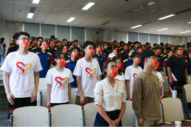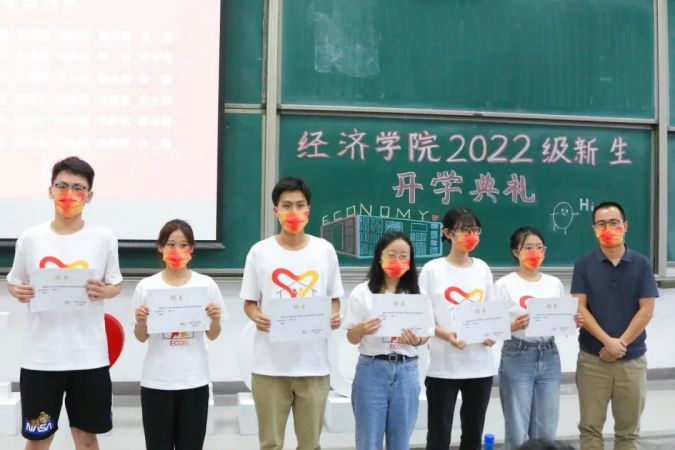 在由295名新生名字拼成的“经世济民”背景板下,全体新生穿着寓意“红色基因、筚路蓝缕、财经黄埔”精神的“红蓝黄”主题文化衫的服装,佩戴2022经院限定版口罩,精神抖擞,意气风发。