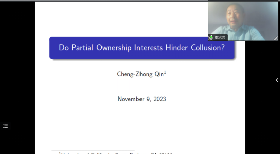 2023年11月10日,加州大学圣芭芭拉分校经济系秦承忠教授应永利集团3044邀请,利用腾讯会议开展了主题为“Do Partial Ownership Interests Hinder Collusion?”的讲座,秦承忠老师受到了老师和同学们的热烈欢迎!永利集团3044尹振东老师主持了讲座,龚雅娴老师参加了讲座。